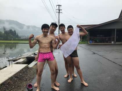 小雨の中、田んぼの中を歩く体験をしました。元気です。