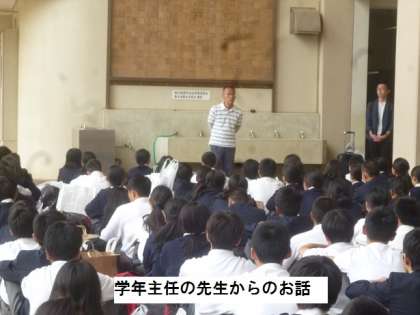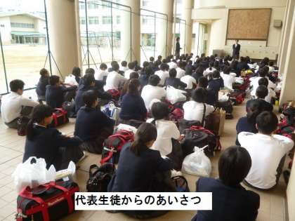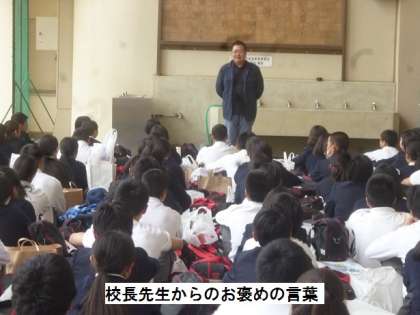 校長先生の話では、ファームステイでの民家の人たちから「東生野中学校の生徒さんたちは良い子ばかりで、家の中の用事も良く手伝ってくれました。」とのお褒めの言葉をいただいたようでした。