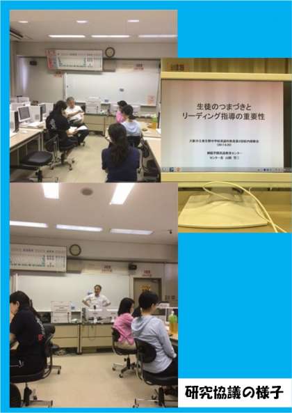 3年2組の英語の授業後、パソコン教室において、研究協議を行いました。授業者の黒羽先生の感想の後、参加者からいろんな意見が出て、有意義な意見交換ができました。後半は、樟蔭学園 英語教育センター長 山岡 賢三 先生から「生徒のつまづきとリーディング指導の重要性」についてのお話を聞きました。ありがとうございました。(校長室)