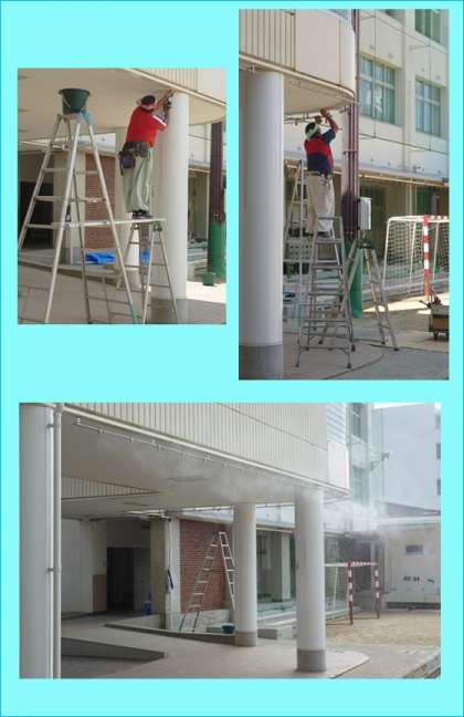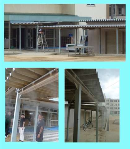 夏の暑い最中、熱中症対策として校内2か所(玄関と体育館前)にミストシャワーを取り付けました。創立70周年記念事業の一環です。