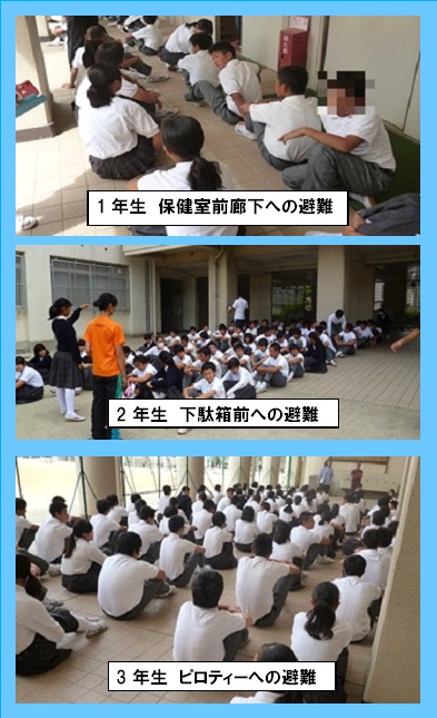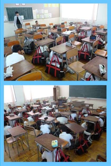 「只今、地震予知緊急速報メールが届きました。すぐに強い地震が起こる可能性・・・・・」という緊急放送とともに、生徒たちは机の下に避難をして、次の指示を待ちました。