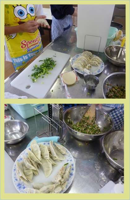 「先生!見て見て〜、上手いやろ〜。」「こんなに早く包めるねん。」「将来、餃子屋さん開きたいなぁ〜。」などの声が飛び交いました。