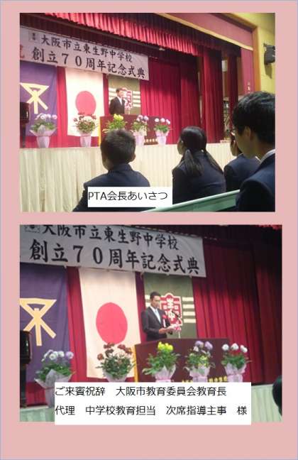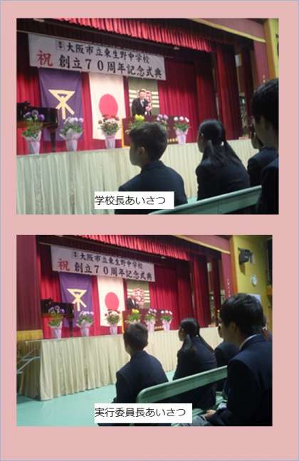 「70年という節目の年に、皆さんと喜びを分かち合えることを幸せに感じております。時には順風満帆でないときも、歴代校長先生をはじめ諸先生方の熱意、地域の皆様方の愛情があって繁栄し続けていると思います。在校生のみなさんは次回100周年でも周年事業に共にお祝いしてください。東生野中学校へのますますの愛情を祈念し、あいさつといたします。」
