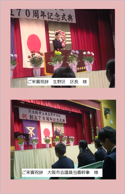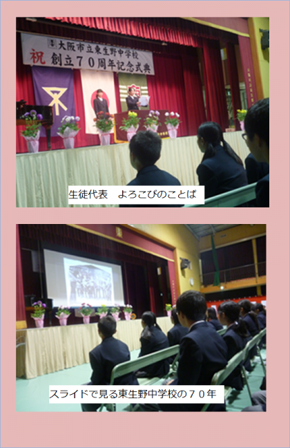 そして、実行委員会作成の東生野中学校の70年の歴史をスライドで振り返りました。様々な驚きの映像に歓声があがっていました。