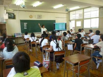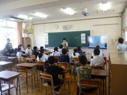 生野区役所の手配で、英語の講師の先生を4人派遣していただき、小学校同士の交流を持ちながら楽しく授業を受けました。