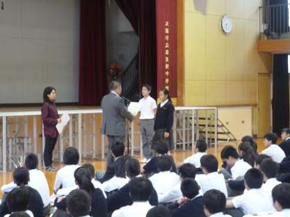 「図書室の利用は、朝登校時に職員室前の利用届けに名前を書いてください。多くの人が利用してください。また、文化祭も観覧態度をきっちりして、出演者をしっかり盛り上げましょう。」