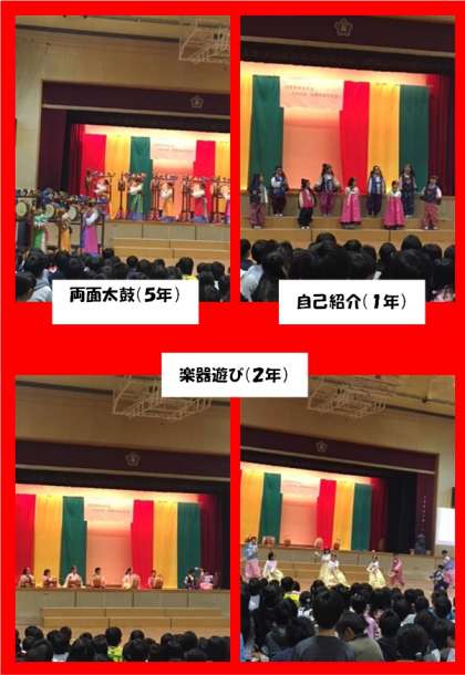 まずは5年生、太鼓の両面をチャンダン・リズムに合わせ、動きをつけ優雅にち力強く太鼓をたたきます。1年生は、大切な名前を一人ずつ紹介しました。2年生は、クエンガリ、チャンゴなどの楽器のリズムを紹介し、みんなで踊りました。(写真:赤)