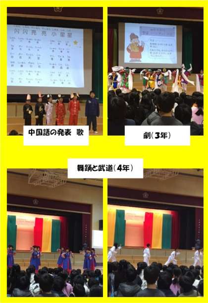 次に中国語の発表では、中国語弁論大会で発表した「きらきら星」を歌いました。3年生は劇と仮面の踊りを、4年生は舞踊と武道を披露しました。(写真:黄)