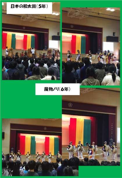 休憩後、5年生の有志が「だんじりばやし」を大太鼓や鐘を叩き、迫力ある演奏ができました。最後は6年生が風物ノリを力を合わせて披露しました。(写真:緑)