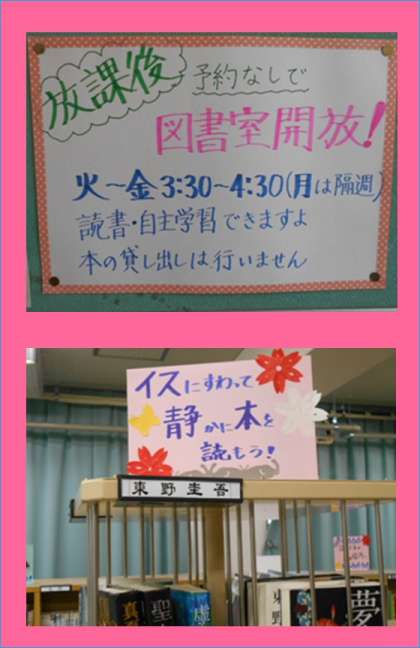 できるだけ多くの本が読めるように、毎日放課後も開館しています。(ただし、本の貸出しは昼の休憩時間のみです。)