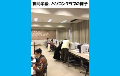 また、本校夜間学級にはパソコンクラブがあり、土曜日にパソコン教室で活動をしています。常時4,5人の参加で積極的に参加しています。