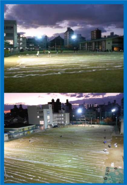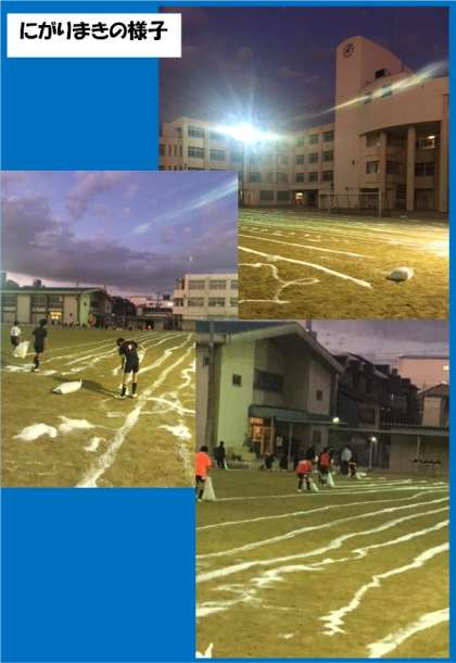北風が強く吹きあれ、グランドが乾燥しがちな冬場に備え、ラグビー部、卓球部、体操部の部員がにがりを一面にまき整備をしてくれました。