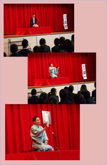 林家小染さんが落語についての解説をしていただき、生徒が落語体験をしました。動作を付けてのダジャレ、うどんを食べるマネなど各学年の代表生徒が高座(こうざ)に上がって体験しました。