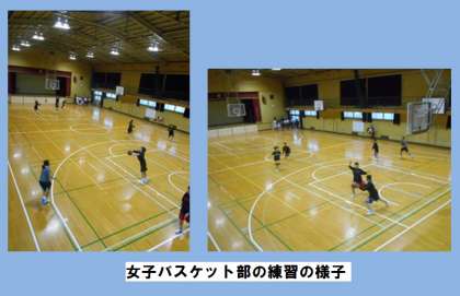 体育館ではバスケットボール部が寒さを吹き飛ばすかのように激しく練習を行っています。3分間ずつ男女交代でパス回しを練習していました。