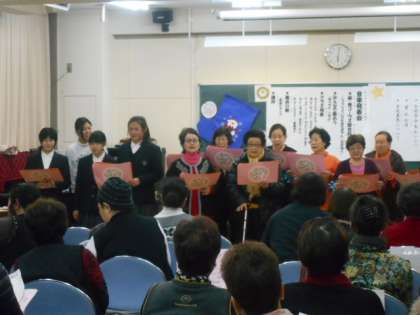 終業式の後、例年行う夜間学級合唱大会のオープニングでも夜間学級のコーラス部と一緒に童謡「証城寺(しょうじょうじ)の狸囃子(たぬきばやし)」と震災復興支援ソング「花は咲く」を披露しました。