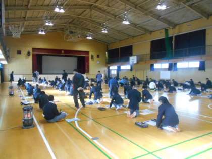 「春の海」などのお正月の風情あるBGMが流れる中、筆を手に半紙に向かって集中していました。