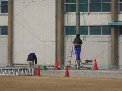 体育館横の防球ネットが数十年の月日の経過の中で破れた箇所がでてきました。
