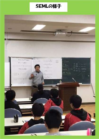 東生野SEMLとは、Saturday English & Mathematics Learningの略で、英語・数学を苦手としている生徒、又は、より深く学習したい生徒に、ボランティア講師から、本来の通常授業に意欲的に参加できるよう、学習指導を受けます。ボランティア講師は本校卒業生(28期生)の青木塾塾長、青木一彦氏に引き受けていただいています。