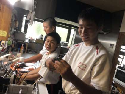 3組男子10班、今夜の食事?ニジマスをさばいています。