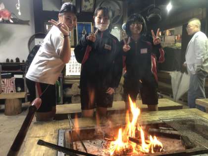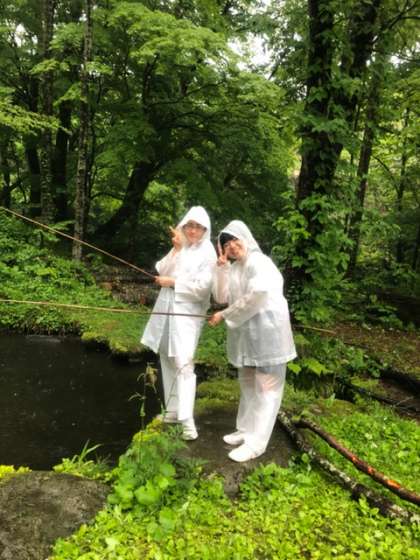 1組女子12班、夕飯のニジマス釣り。1人二匹釣るのがノルマ。しかし、なかなか釣れなくて苦戦中な2人。