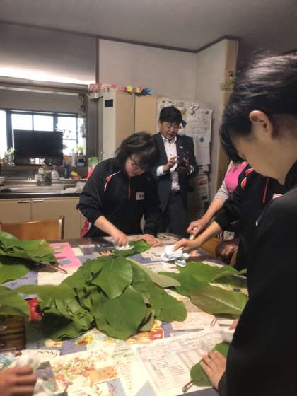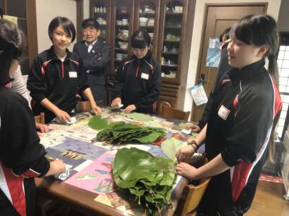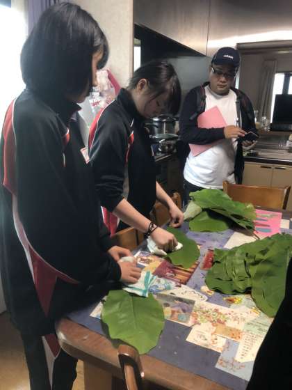 1組女子13班、今日の夕ご飯の準備中。この葉の中にアジやごはんを入れます。楽しみ。(浅野)