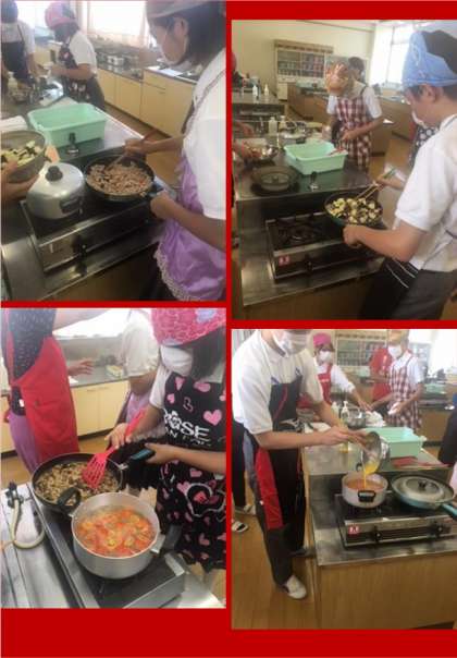 校内でなすとトマトを栽培していて、その食材を使っての調理実習です。4人の班を2グループ作って調理しました。