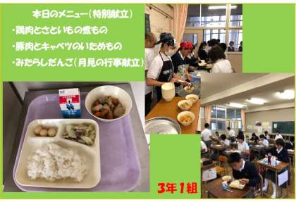 本日の給食は「月見の行事献立」ということで、「鶏肉とさといもの煮もの」・「豚肉とキャベツのいためもの」・「みたらしだんご」でした。
