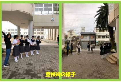木曜日は学年別集会が行われます。生徒会役員が門において呼びかけています。8時25分までに整列完了を全学年目指しています。
