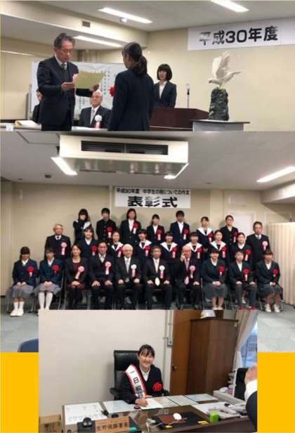 昨日、生野税務署において「平成30年度 中学生の税についての作文表彰式」が行われました。本校3年1組相葉也奈さんが近畿税理士会生野支部長賞を授与し、表彰式に参加しました。