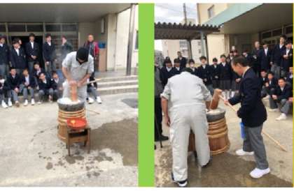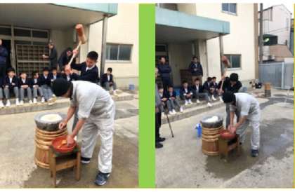 生徒たちは最近見かけなくなった餅つきを体験し、つきたてのお餅を美味しくいただきました。