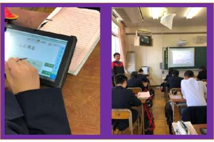 6時間目にICT研究授業対象クラスである2年2組において、田中先生による英語の研究授業を行いました。タブレットを使った英語授業の発表ということで、いつも英語教育でお世話になっている樟蔭大学の山岡先生はじめ校内の教員が見守る中、田中先生も生徒も少し緊張した様子の授業展開でした。