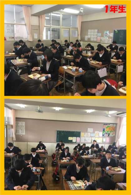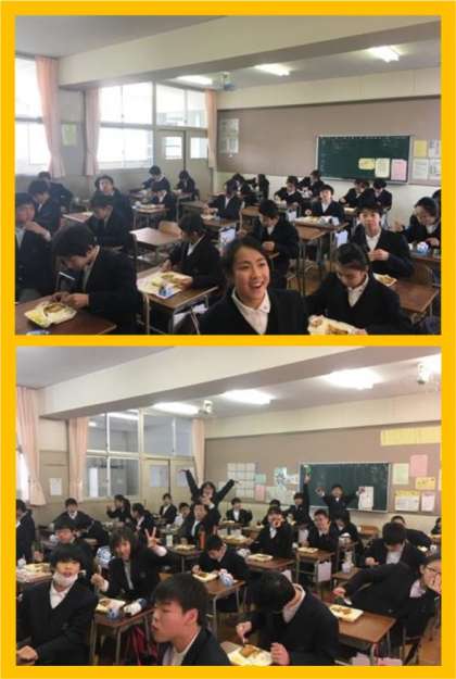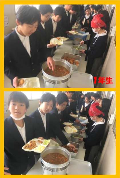 本日のメニューは、生徒たちに人気のあるカレーライスでした。一口トンカツとサラダ、洋なし(缶)がついていました。