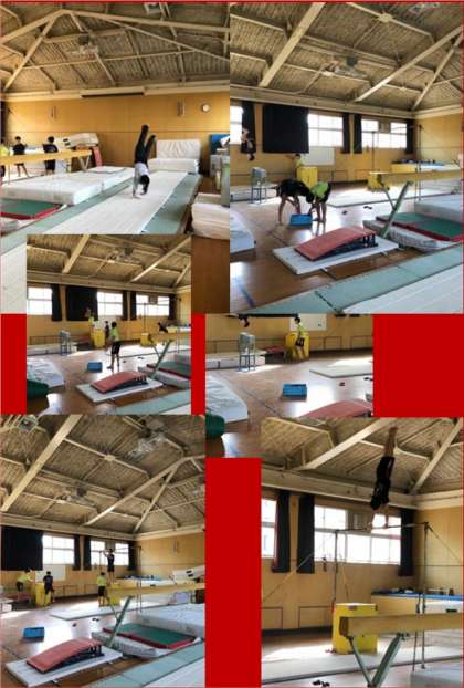 午前中グランドではラグビー部1年生、2年生は南地区選抜セレクションに出かけており、体育館では卓球部が午前中、午後は女子バスケット(写真上)が活動しています。男子バスケットは練習試合に出かけています。格技室では体操部が活動しています(写真下)。