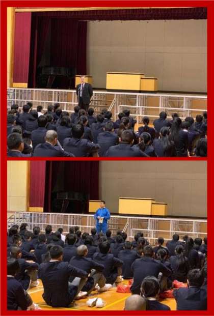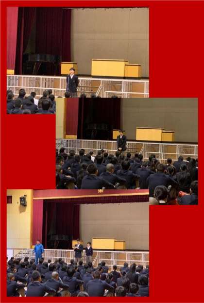 3年生の一部生徒は公立高校の入試で欠席ですが、今年度最後の生徒集会を体育館で行いました。