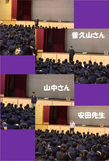 修了式の後、離任式です。国語、生指、ラグビー部と10年間勤務された安田先生が退職、事務室の普久山さん、管理作業員の山中さんが異動となります。3名から最後のお言葉をいただきました。