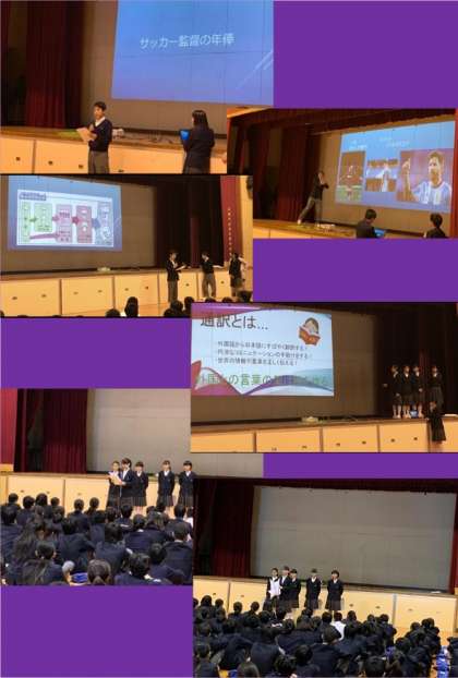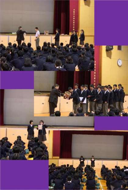 続いて、生徒会の進行で、ラグビー部の表彰、元気アップ漢字検定学習会皆勤賞の授与、国際クラブ朝文研の活動で韓国・朝鮮語弁論大会に参加した1年生2人が同内容を披露、2年生からはキャリア教育の一環で各班、仕事についてのプレゼンを行った大会での優秀な3班が同内容でプレゼンをしました。