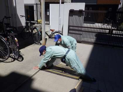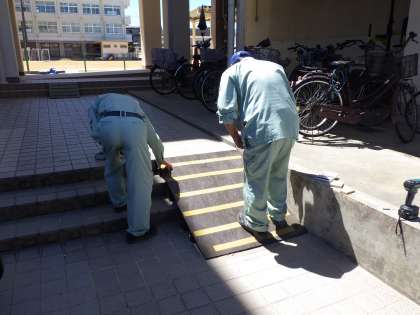 9月2日(火)暑い中、管理作業員さんが北門のスロープの修理をしてくれています。