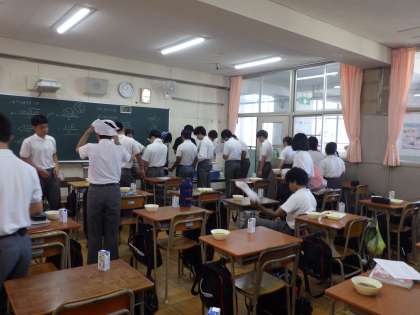 9月9日(火)今日の給食はマーボーナス、ツナと野菜の炒め物、焼きサツマイモの甘みつかけ、ご飯です。みんなで給食の準備をしています。3年生、2年生、1年生の様子です。