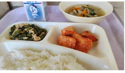 給食では、しょうが汁、にんにく、砂糖、塩、こいくちしょうゆ、ケチャップ、トウバンジャンを混ぜ合わせて作っています。