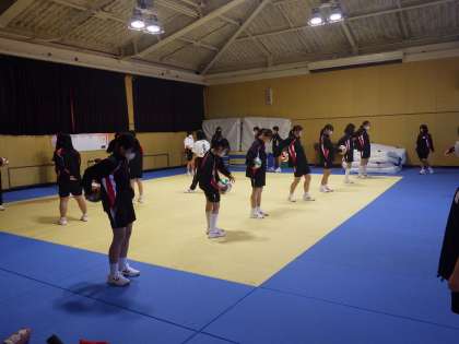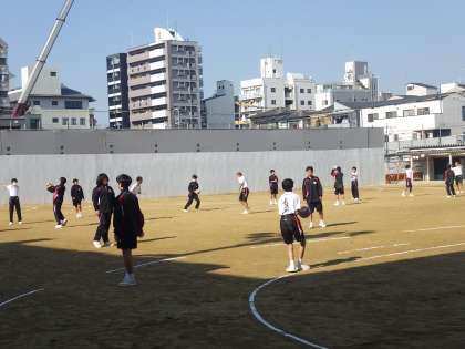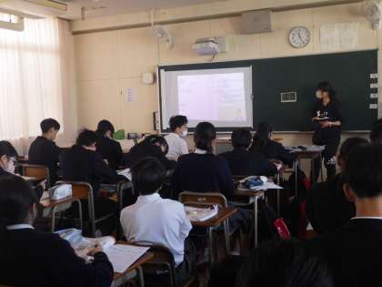 11月17日(月)青空が広がった運動場で1年生の男子が体育の授業を頑張っています。女子は格技室での体育です。英語の授業の様子です。