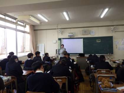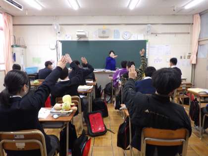 12月3日(水)朝から冷え込んでいますが子どもたちは元気です。1年生は運動場で体育のバレーボール、2年生は家庭科、3年生は国語です。頑張っています。