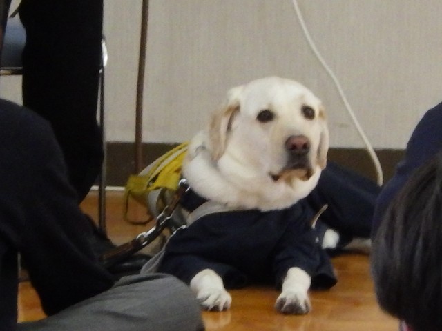 2月24日(火)3年生は視覚障害の方の学習です。盲導犬マシューも一緒です。