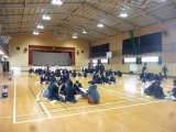 1年生全員で書初め大会を体育館で行いました。「春の海」や「雅楽」等の曲が流れる荘...