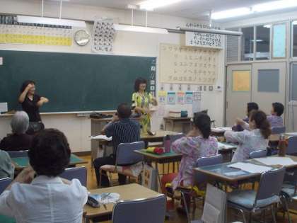 【写真】F組教室で体験指導をされる浦川さん(右)