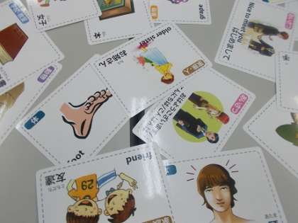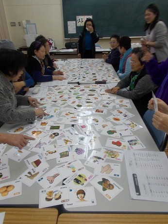 ソンセンニムにハングルで単語を読んでもらい、その言葉を日本語に訳したり絵を見たりして絵札を取りました。