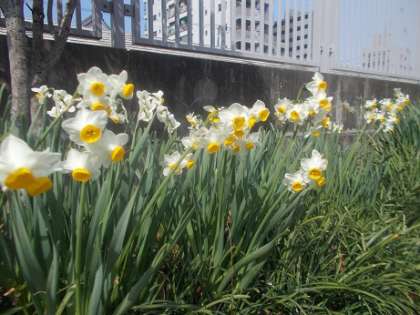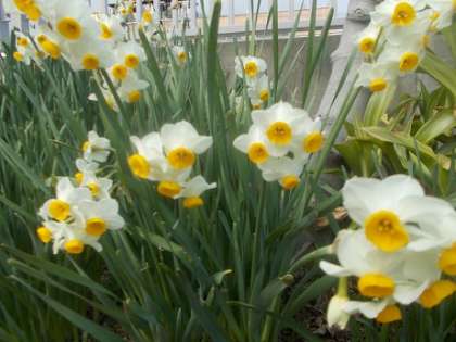 校庭の西柵に沿って、水仙が群生し、凛とした佇まいで風にそよいでいます。