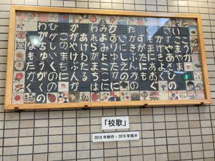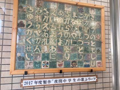 ↑夜間学級の玄関を入って左側に、美術授業で作られた夜間中学生の歌のレリーフがあります。