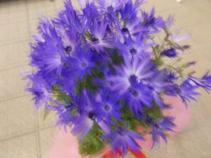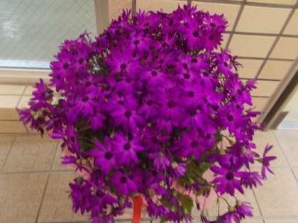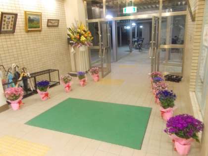 3月12日の卒業式に卒業生を見送った花が玄関を鮮やかに彩っています。