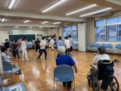 みなさん笑顔で、体育の先生を囲んで動きを確認し、円形にまわりながらリズムに乗っていました。