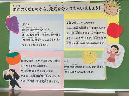 10/1 保健室前 公開日 2021/10/01 更新日 2021/10/01 お知らせ 今日から10月です。季節の変わり目で、疲れが出やすい時期です。体感温度が涼しいから寒いに変わるので、服装も気をつけてくださいね。 皮をむくとすぐ食べられるくだものにも、いろいろな効果があります。保健室前で、一度確認してみてください。 いいね(0)